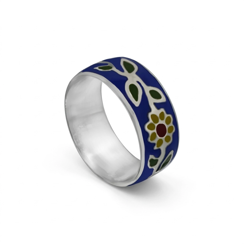 El Anillo Flores de Luz combina simplicidad y arte. Fabricado en plata ley 925, esta pieza destaca por su diseño pintado a mano: una flor amarilla con pétalos verdes sobre un vibrante fondo. Es el accesorio perfecto para quienes buscan un estilo fresco y único.