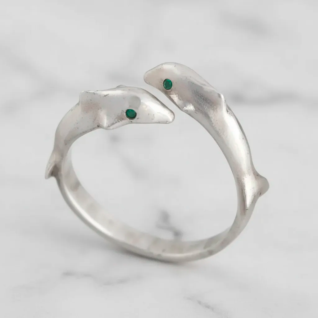 Sumérgete en la belleza del mar con el Anillo Océano Eterno, una pieza cautivadora en plata ley 925 que representa la armonía y libertad de los océanos. Su diseño presenta dos elegantes delfines, símbolo de amor, protección y conexión infinita.