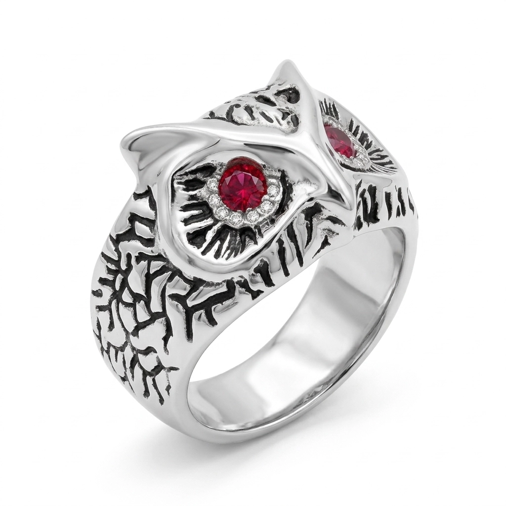 Anillo Sabiduría Nocturna es una joya premium para amantes de la naturaleza y los diseños simbólicos. Hecho en plata ley 925, presenta un detallado búho con ojos de circon corte diamante y un acabado negro que resalta sus plumas, logrado mediante un delicado proceso de quemado. Este anillo grueso representa sabiduría y misterio.